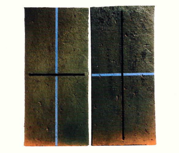 ‘Lignes', dubbelbeeld met lijnen in blauw pigment, schaduwlijnen en lichtlijnen, hoogte 22cm.