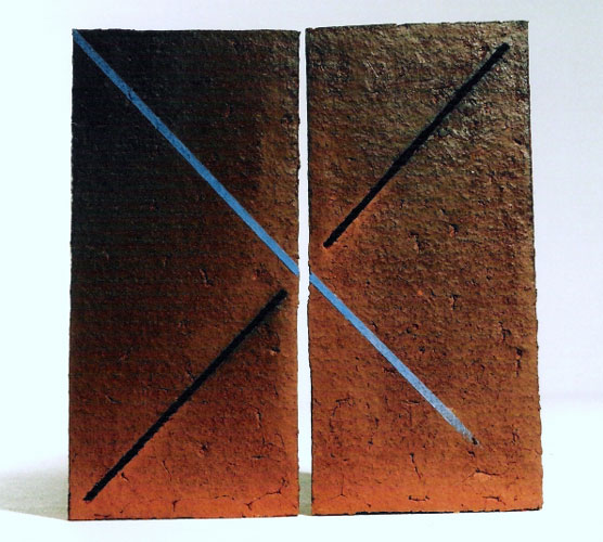 ‘Lignes', dubbelbeeld met lijnen in blauw pigment, schaduwlijnen en lichtlijnen, hoogte 22cm.