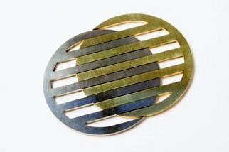 Alpaca en messing, techniek: waterjet, diameter 65 mm. Kleine oplage