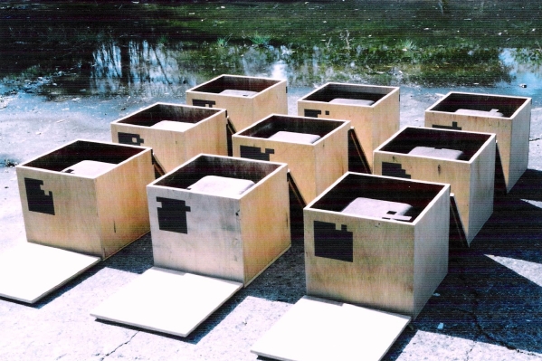 Installatie Levantkade, keramiek, hout, teer, afmeting in deze opstelling: 150x150cm oppervlakte